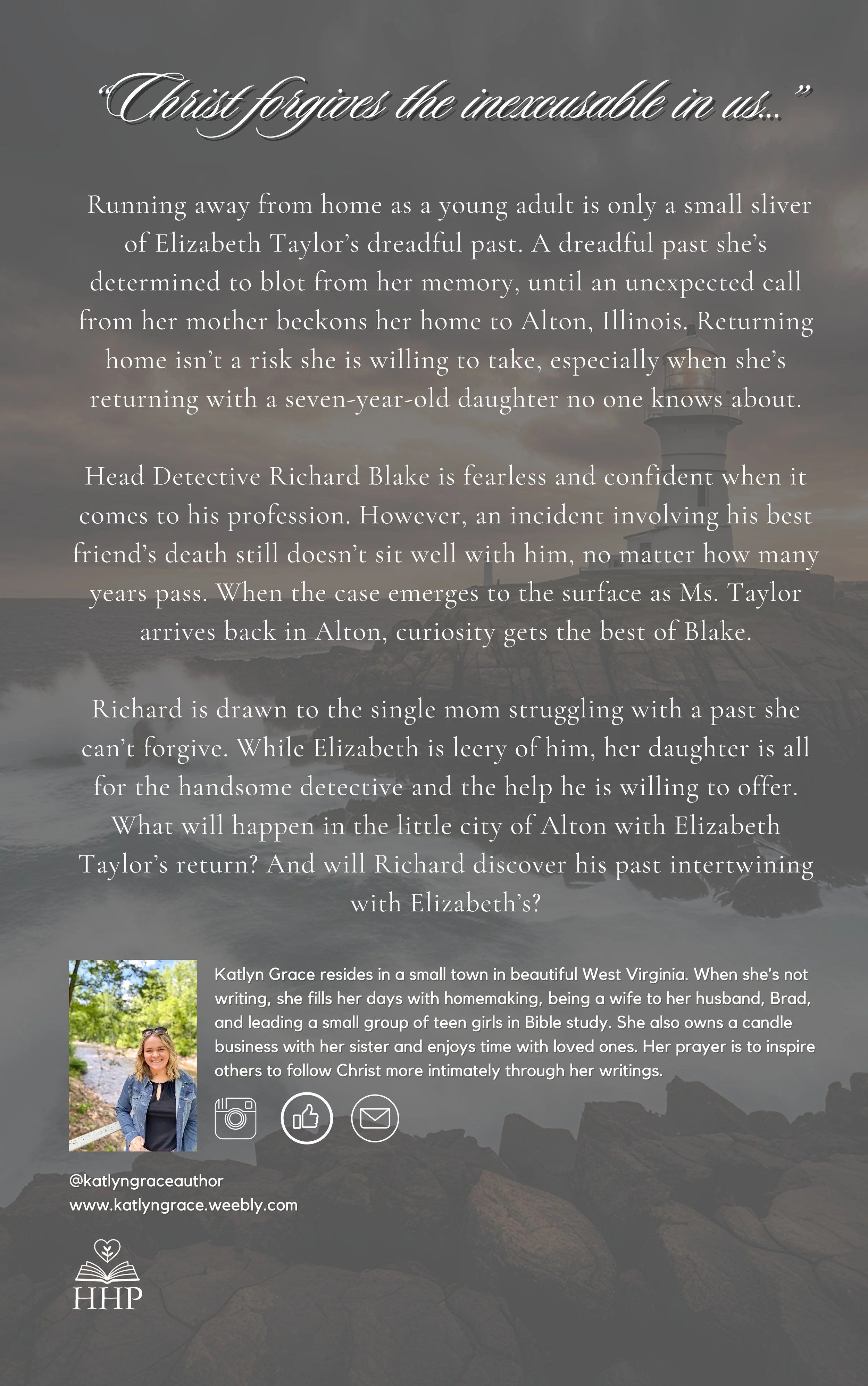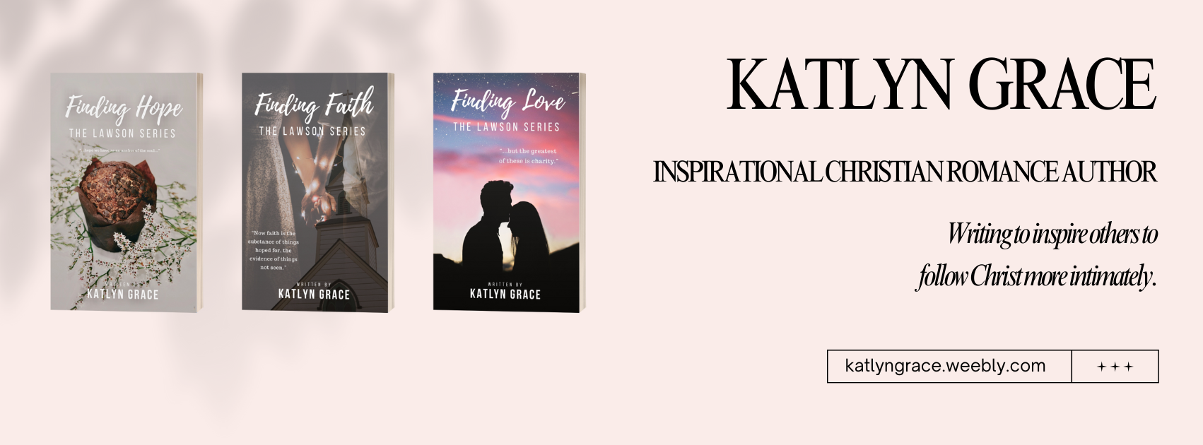 Katlyn Grace is a twenty-five-year-old writer residing in a small town in beautiful West Virginia. When she’s not writing, she fills her days with homemaking, being a wife to her husband, Brad, and leading a small group of teen girls in Bible study. She also owns a candle business with her sister and enjoys time with loved ones. Her prayer is to inspire others to follow Christ more intimately through her writings.